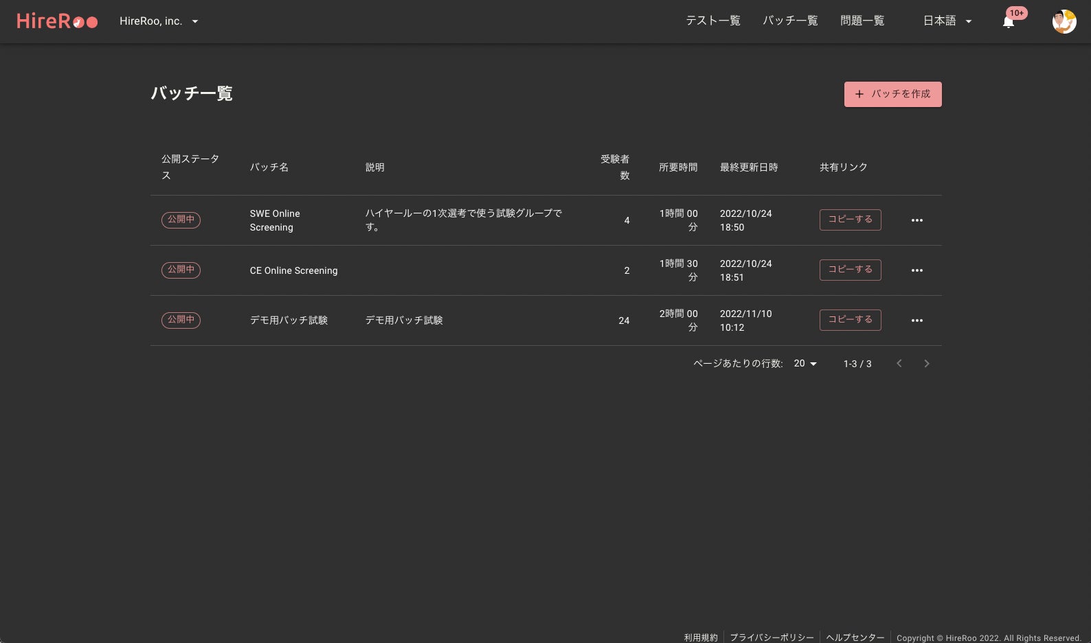 株式会社ハイヤールー(本社:東京都渋谷区、代表取締役:葛岡宏祐)が提供するコーディング試験サービス『HireRoo(ハイヤールー)』(https://hireroo.io)にて、バッチ機能の追加と問題数の100問突破をお知らせいたします。バッチ機能の活用と未経験者向けの問題追加により、新卒採用・ポテンシャル採用にも活用しやすくなりました。