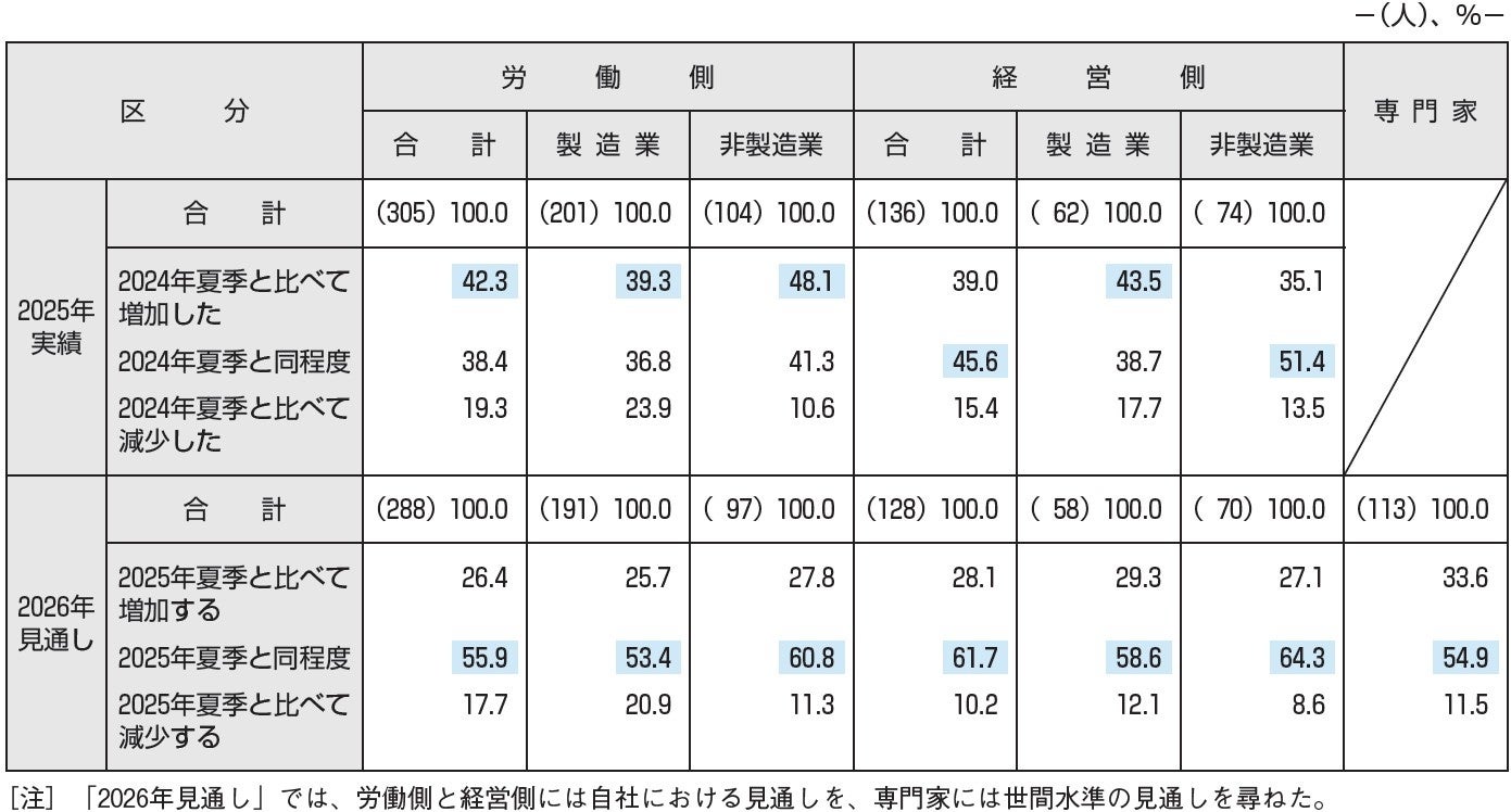 夏季賞与・一時金について、労働側と経営側には自社における“25年実績”と“26年見通し”を、専門家には26年の世間水準の見通しを、それぞれ「前年夏季の水準との比較」で尋ねた。まず、25年実績を見ると、「増加した」が労働側42.3%、経営側39.0%、「同程度」が同38.4%、45.6%となり、「減少した」は労使ともに1割台である。次に、26年見通しを見ると、「同程度」が労働側55.9%、経営側61.7%で過半数に達しており、「減少する」は労使ともに1割台にとどまる。専門家の見通しは、「同程度」が54.9%と最も多く、「増加する」は33.6%、「減少する」は11.5%である。