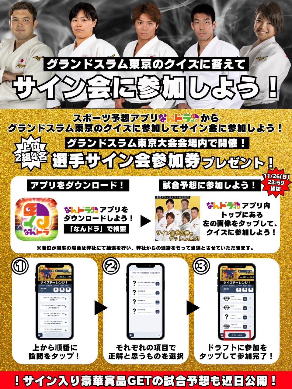 柔道『グランドスラム東京 2023』に今年も「なんドラ」が参戦!大会の活躍選手予想に先駆け、サイン会ペア参加券が当たるクイズチャレンジ企画を開催