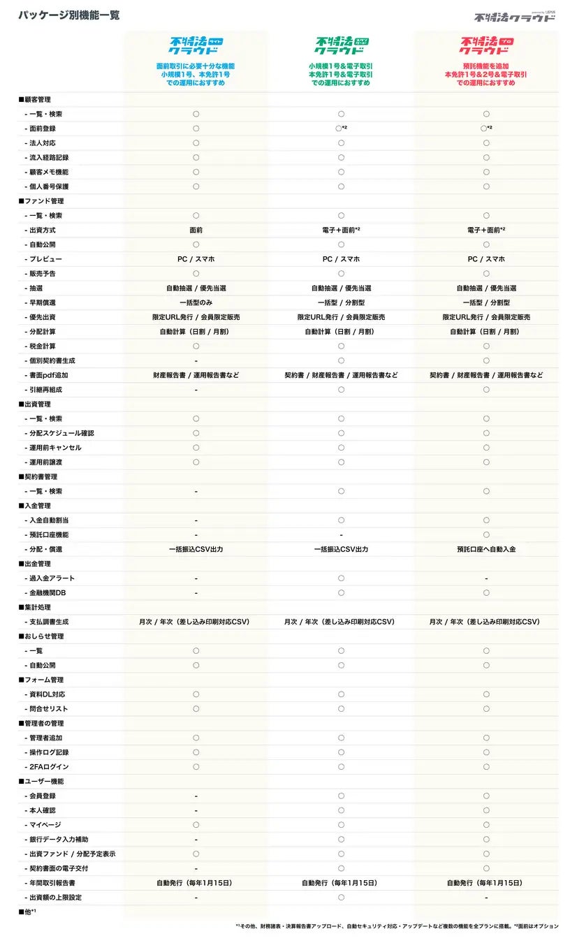 「不特法クラウド」は、面前のみからクラウドファンディングまで、事業者の導入フェーズや事業規模に合わせた3つのプランをご用意しています。