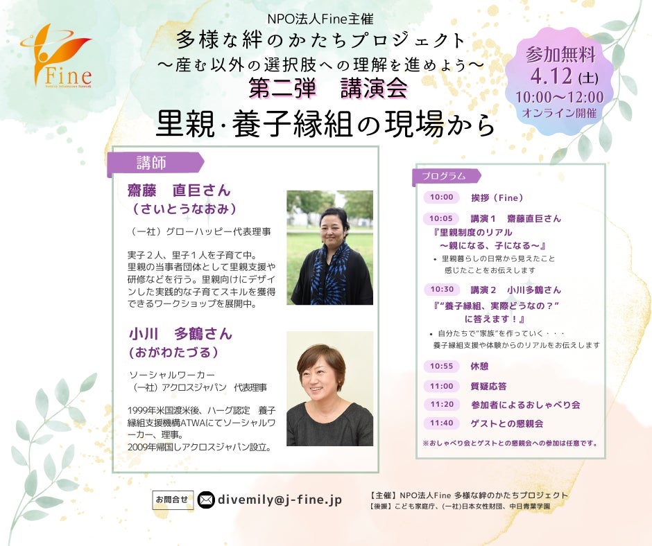 不妊治療患者をはじめ不妊・不育で悩む人をサポートするセルフサポートグループNPO法人Fine(ファイン)の「多様な絆のかたちプロジェクト」は、4月12日(土)に、第二弾として講演会「里親・養子縁組の現場から」をオンラインで実施いたします。