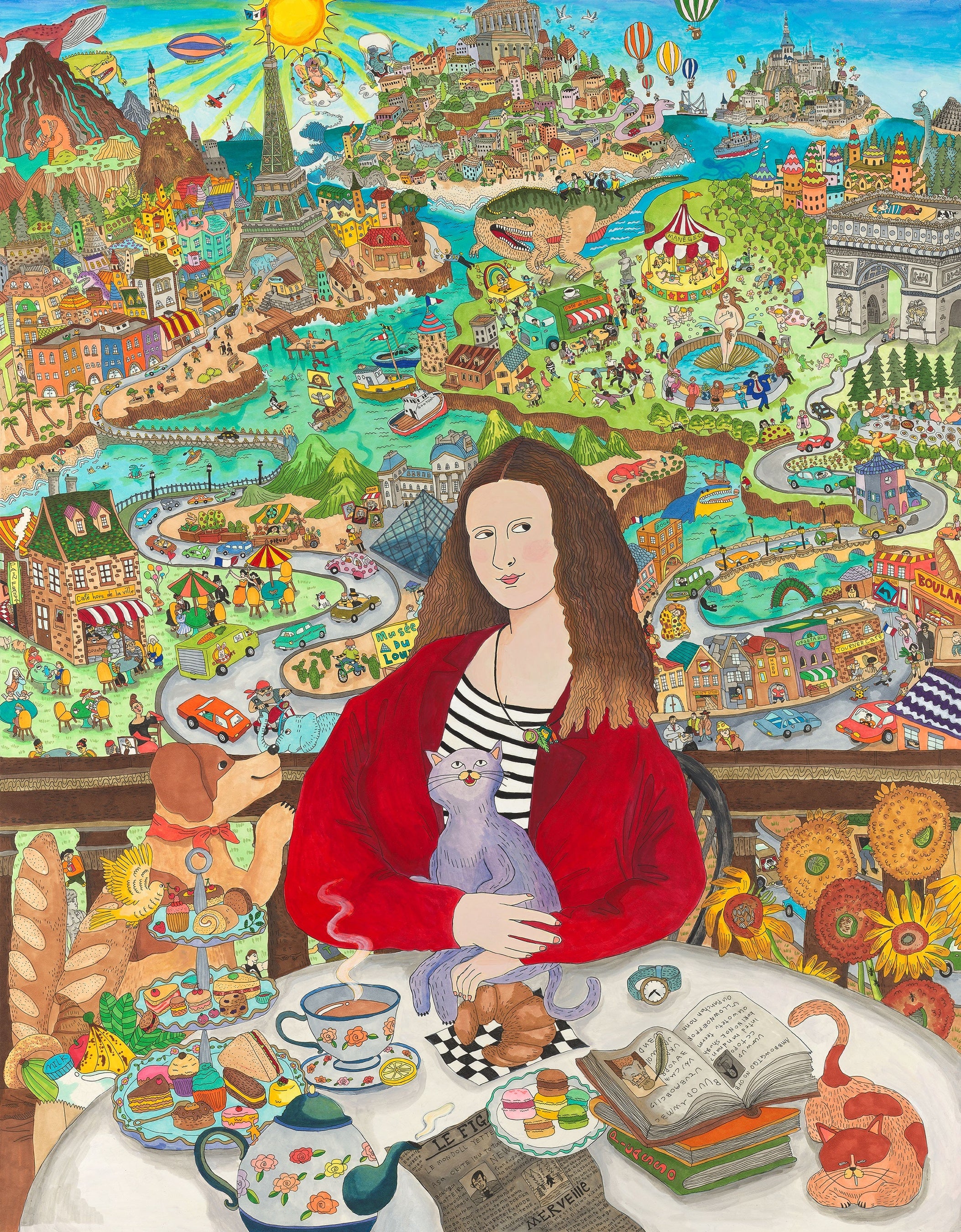 優しく鮮やかな色彩と温かな物語のモチーフで描き出す作品は、日常のささやかな喜びやユーモアを、名画や歴史的モチーフの現代的再解釈として表現しています。観る者に深い温もりと余韻を残す若き作家です。