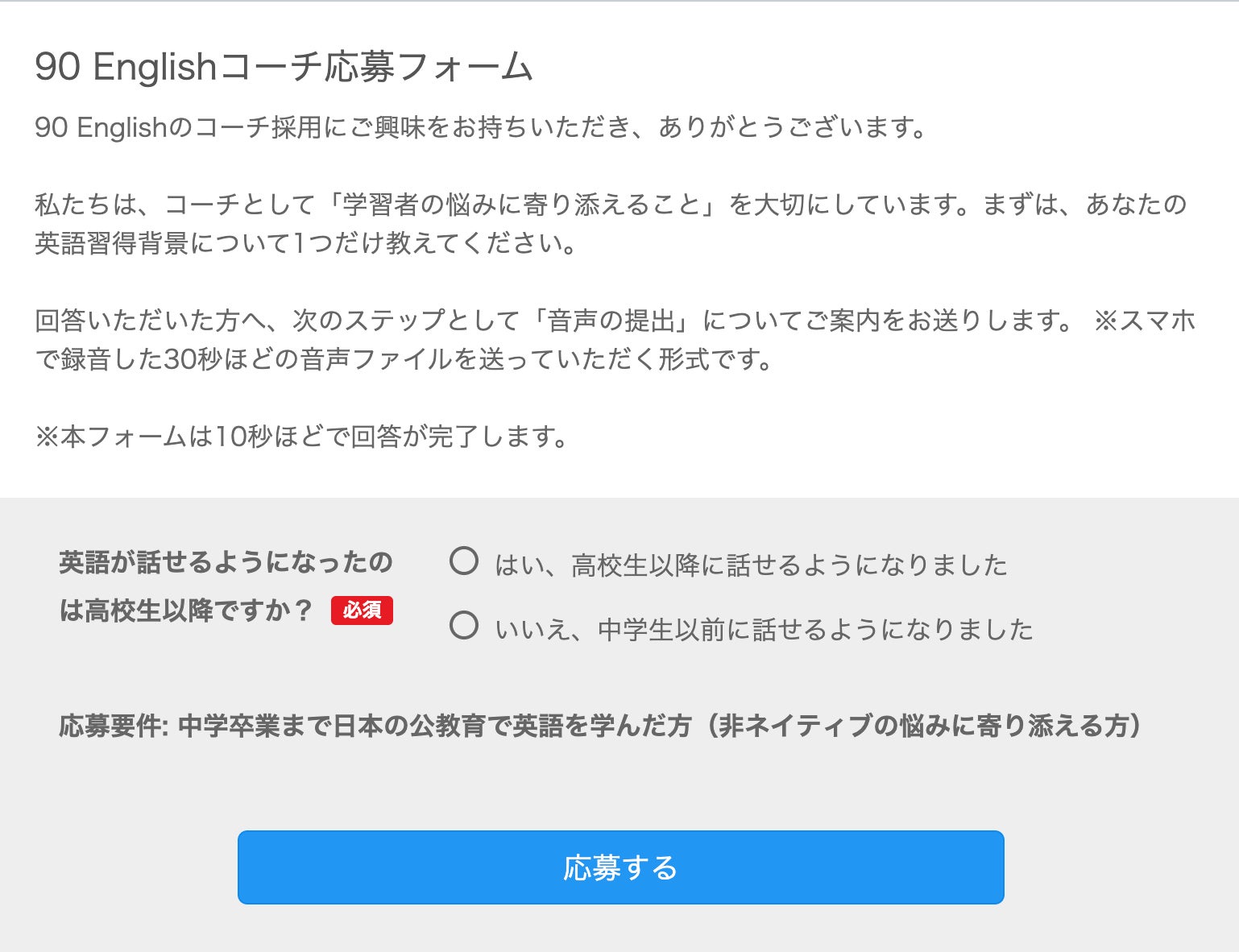 これまで90 Englishの英語コーチに応募していただく際、13項目の質問への回答と、英語での自己紹介動画(1分間)の撮影・提出をお願いしていました。