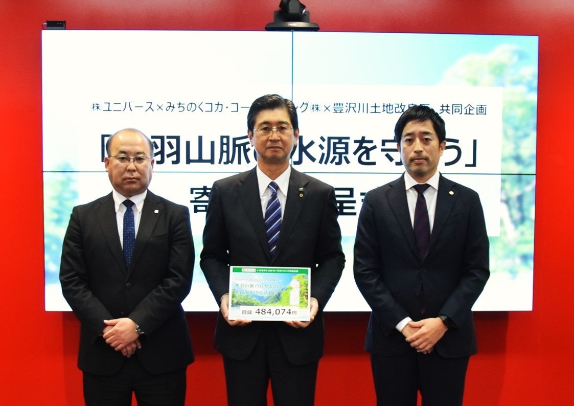 みちのくコカ・コーラボトリング株式会社(本社: 岩手県盛岡市、代表取締役社長: 谷村 広和、以下「当社」)は、株式会社ユニバース(本部: 青森県八戸市、代表取締役CEO: 三浦 紘一)、豊沢川土地改良区(所在地: 岩手県花巻市、理事長: 久保田 泰輝)と協働し、「奥羽山脈の水源を守ろう!」キャンペーンを実施し、12月22日(水)に寄付金贈呈式を開催いたしました。