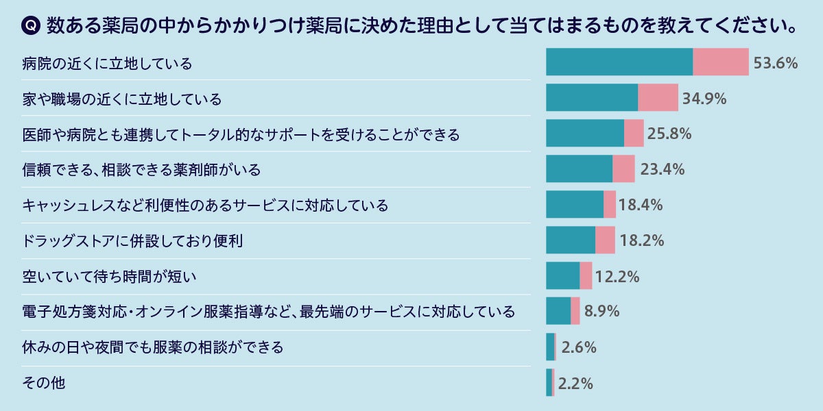 薬の重複投与や飲み合わせの影響による副作用などの健康被害を防ぎ、適切な服薬を実現するためにはかかりつけ薬局を持つことが非常に重要です。かかりつけ薬局を決める際に大切なポイントは、信頼、相談できる薬剤師がいることです。加えて薬剤師との円滑なコミュニケーションや待ち時間削減などを実現するデジタルサービス活用によるメリットをいかに享受できるかも、かかりつけ薬局を選ぶ理由になることが今後期待されます。