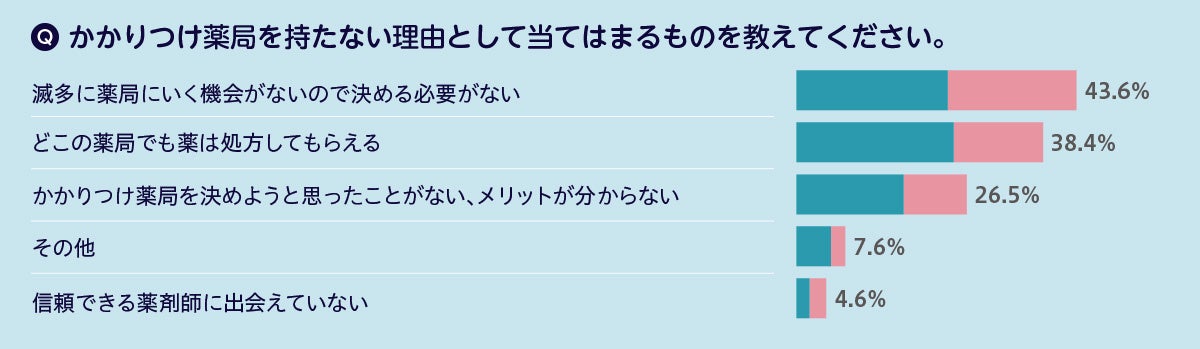 かかりつけ薬局を決めているかの問いでは、全体の約半数の46.1%が「はい」と回答し、かかりつけ薬局に決めた理由としては「病院の近くに立地している(53.6%)」、「家や職場の近くに立地している(34.9%)」といった立地条件を理由とした回答が目立ち、続いて「医師や病院とも連携してトータル的なサポートを受けることができる(25.8%)」、「信頼できる、相談できる薬剤師がいる(23.4%)」 という回答結果になりました。また、かかりつけ薬局を決めない理由として最も多かったのが「滅多に薬局に行く機会がないので決める必要がない(43.6%)」という回答で、頻繁に薬局に行かない人はかかりつけ薬局を決めない傾向にあることが分かりました。