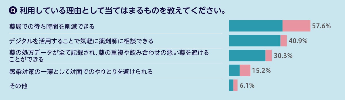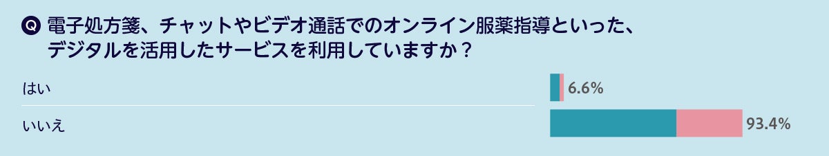 電子処方箋、チャットやビデオ通話でのオンライン服薬指導を含むデジタルサービスを利用しているかについては、利用したことがある人はわずか6.6%でした。利用する理由としては、「薬局での待ち時間を削減できる(57.6%)」、「気軽に薬剤師に相談できる(40.9%)」が多く、利用者は待ち時間の効率化や、薬剤師とのコミュニケーションの選択肢広幅化のメリットを享受していることが示唆されます。