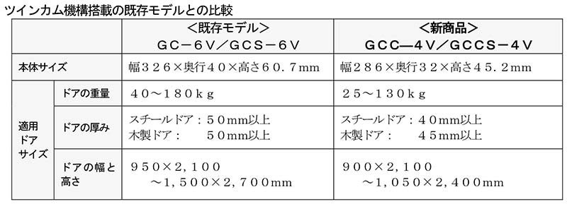 本新商品は当社独自のツインカム機構により、安定した速度でドアをしっかり確実に閉めることが可能です。同じ機構を搭載する既存モデル(GC-6V/GCS-6V)に比べ、本体の厚みと高さを約20%小さくし、より薄いドアや多様な框扉にも取り付けることができるようになりました。本新商品はツインカム機構の特長をそのまま維持しつつ、本体のコンパクト化を実現しました。ドア重量130kg以下のドアに対応しています。