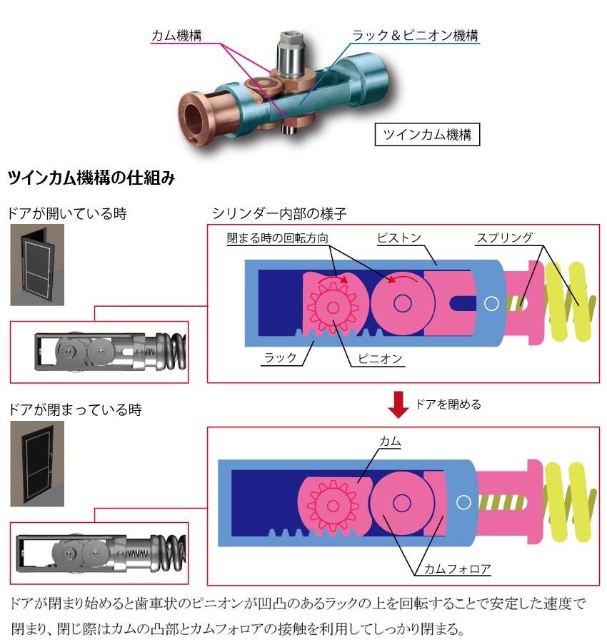 新商品には、当社独自のツインカム機構を採用しています。ドアを安定した速度で閉める「ラック&ピニオン機構」にドアを確実にしっかり閉める「カム機構」を加え、安定した閉鎖速度と高い閉鎖力の両立を実現しています。コンパクトな本体で十分な閉鎖力を実現するために、スプリングと歯車(ピニオンギア)を改良し、強度と耐久性を維持しました。