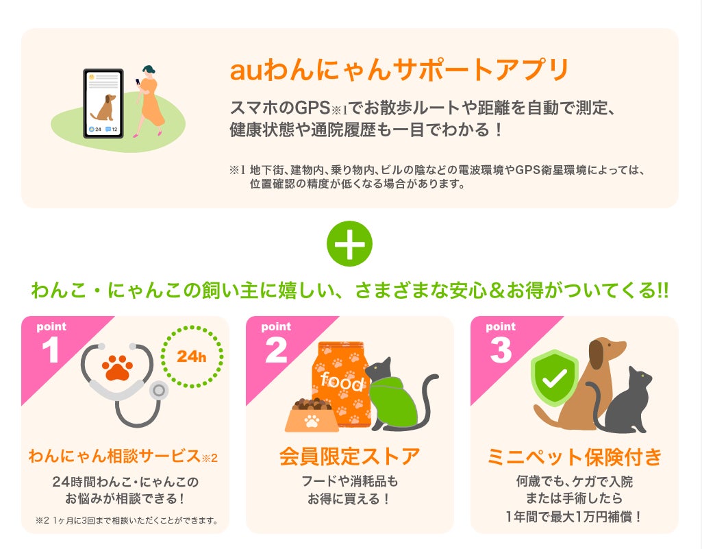 本サービスは月額550円で、スマートフォンのGPSでペットの散歩ルートや距離を自動測定、健康状態管理もできる「auわんにゃんサポートアプリ」のほか、24時間年中無休で獣医師などに電話相談が可能な「わんにゃん相談サービス」、ペットフードなどをおトクに買える「会員限定ストア」、ペットの怪我の治療費をサポートする「ミニペット保険」のサービスをセットで利用できます。