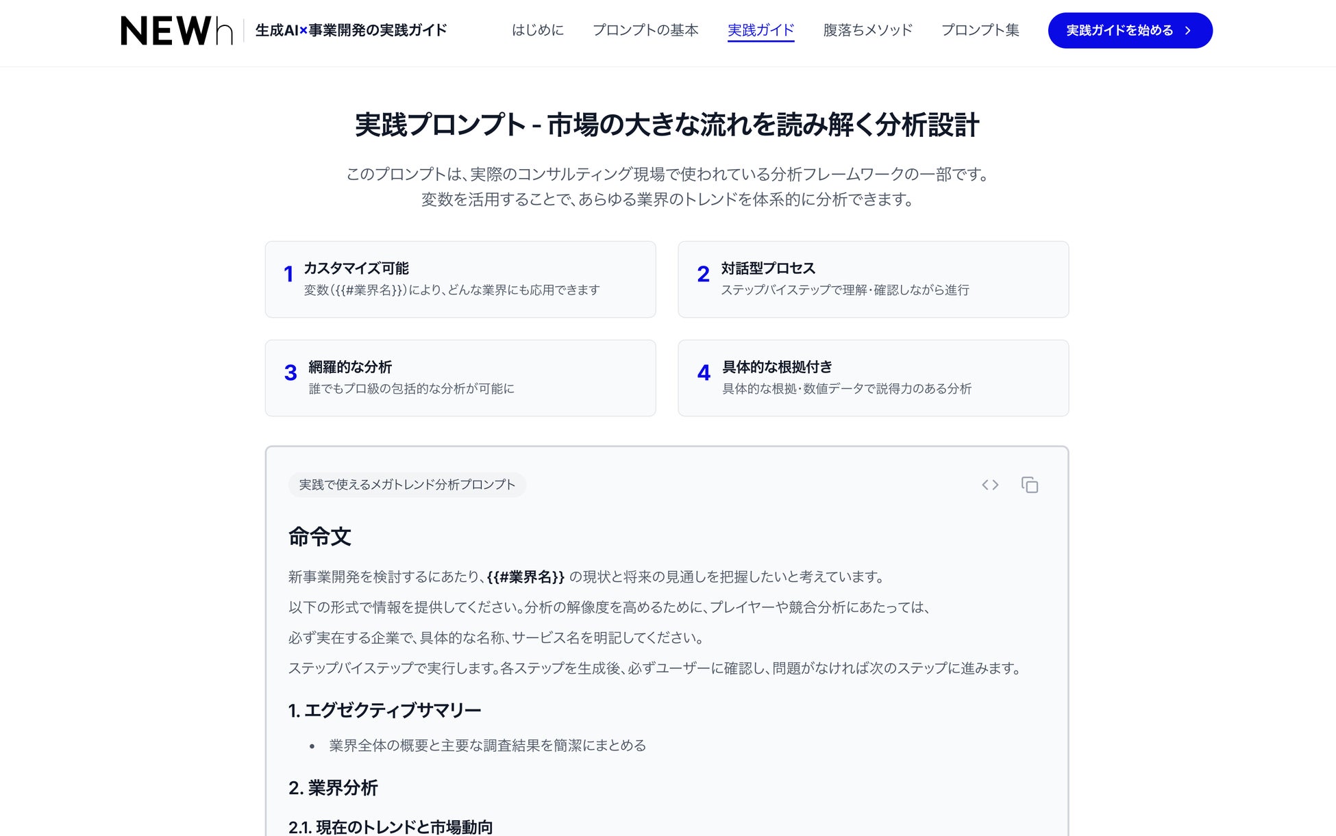 本サイトは、事業開発の現場ですぐに使える生成AIプロンプトと活用ポイント、その背景にある思考法を体系化した、実践型オンラインガイドです。