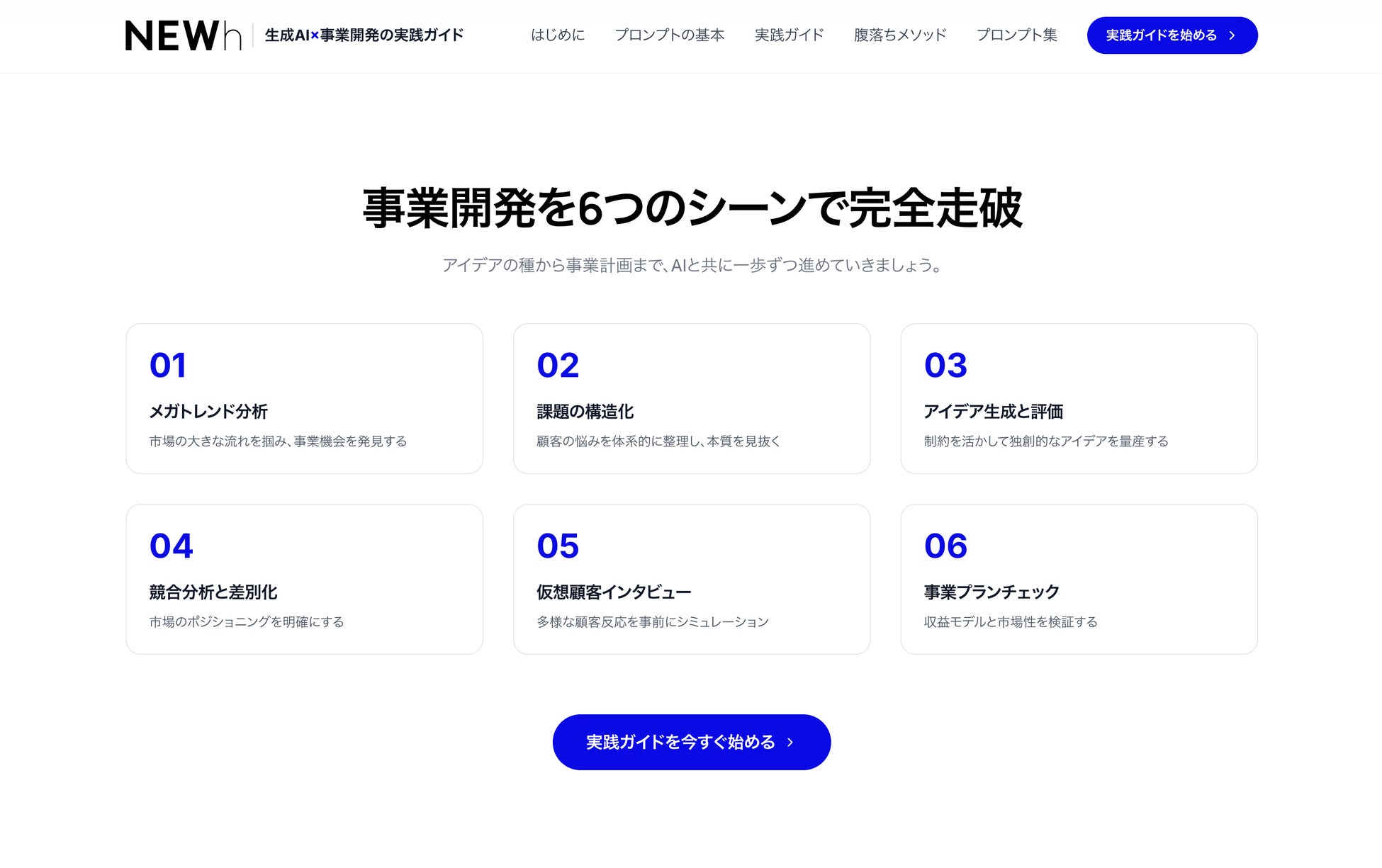 株式会社NEWh(本社:東京都千代田区、代表取締役:神谷 憲司、以下「NEWh」)は、生成AIを活用した事業開発の実践的手法をまとめた「生成AI×事業開発の実践ガイド」サイト(https://ainewbiz.newh.co.jp)を2025年7月9日に公開しました。