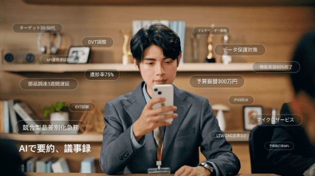 会議、打ち合わせ、勉強会で取ったメモ、あるいは録音を振り返るのは面倒ですが、本製品は録音データを迅速に文字起こし・要約できます。大事な予定を忘れがちな人も録音機能をご利用ください。AIが予定・タスクを自動生成し、手元に通知します。AI呼び出し、通話録音可能など便利な機能で「仕事あるある」をスマートに解決。