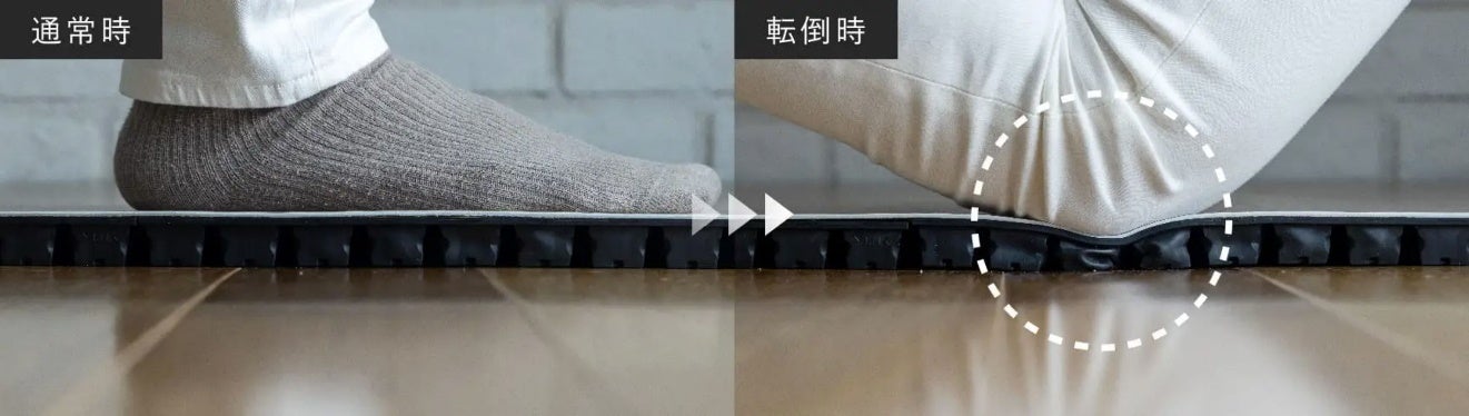 その家族を守り、最期まで尊厳を持って生きられる社会を実現することを目的に、歩行時や車椅子移動時の安定性と転倒時の衝撃吸収性を両立する荷重特性を構造で実現した、普段は硬く、転んだ時には柔らかくなる置き床「ころやわ」を開発しました(図1)。JHeC2021にてマジックシールズがグランプリを獲得したことをきっかけに「ころやわ」は大きな注目を集めましたが、医学的エビデンスの構築が必要と考えられ、InnoHubサポーター団体である東京医科歯科大学が紹介されたところ、骨折治療と生体力学解析の専門家である整形外傷外科治療開発学講座の王耀東講師が共同研究の意思を示し、2021年7月27日に共同研究契約が締結されました。