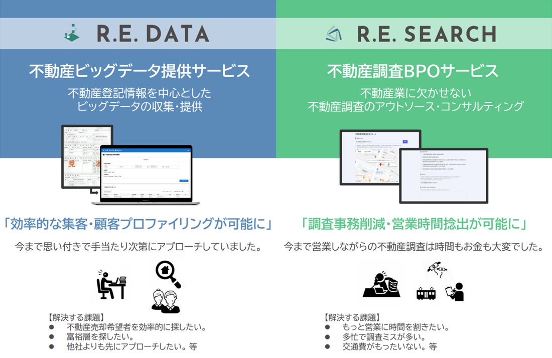 「R.E.DATA」は、インターネット上に存在しない役所、法務局や現地のみに存在するアナログな不動産情報を中心にビッグデータを形成し、法人顧客に対して、オーダーメードでデータを収集・分析・整備し、マーケティングに関する課題を解決するサービスです。
