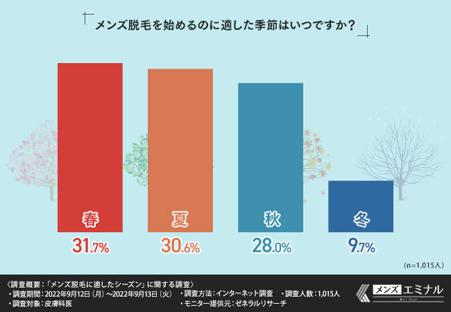 「メンズ脱毛を始めるのに適した季節はいつですか?」と質問したところ、『春(31.7%)』『夏(30.6%)』『秋(28.0%)』『冬(9.7%)』という結果となりました。