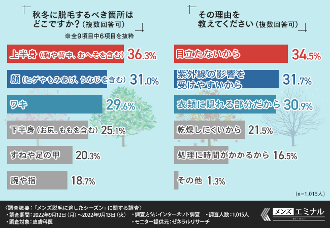 「秋冬に脱毛するべき箇所はどこですか?(複数回答可)」と質問したところ、『上半身(胸や背中、おへそを含む)(36.3%)』『顔(ヒゲやもみあげ、うなじを含む)(31.0%)』『ワキ(29.6%)』と続きました。