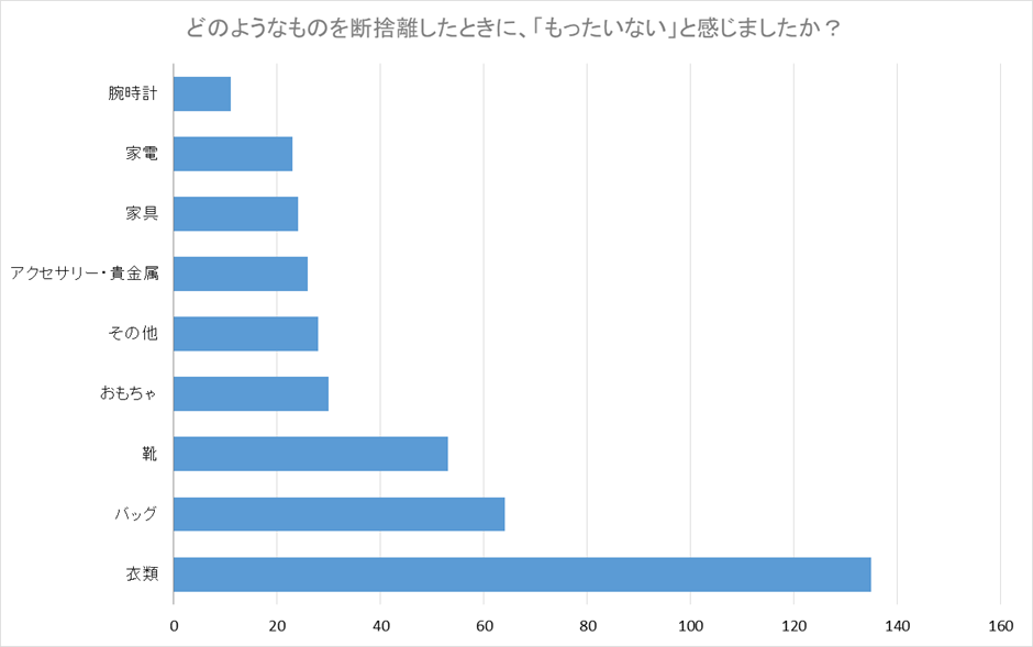 断捨離したときに「もったいない」と感じたものについて質問したところ、「衣類」という回答が最も多く、バッグ・靴・おもちゃの順に続く結果となりました。