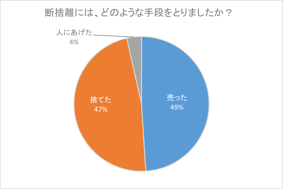 「断捨離には、どのような手段をとりましたか?」という質問では、「売った」と回答した人が49%、「捨てた」と回答した人が47%で、ほぼ同率でした。