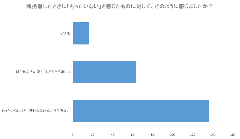 「もったいない」と感じつつも断捨離したものに対して「使わなくなったから仕方ない」と回答した人が136件(全体の68%)にのぼりましたが、その一方で「誰か他の人に使ってもらえたら嬉しい」と回答した人も63件(全体の32%)見受けられました。