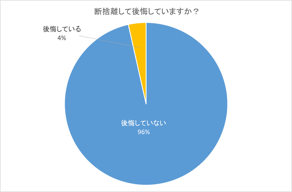 「断捨離して後悔していますか?」という質問に対しては、「後悔していない」が96%、「後悔している」が4%という結果になりました。