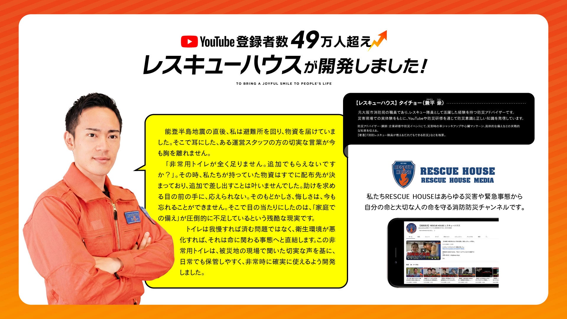 本製品「トイレの用心防」は、元消防士であり、YouTube登録者数約49.6万人の消防防災チャンネルを運営するレスキューハウスの監修・開発のもと誕生しました。