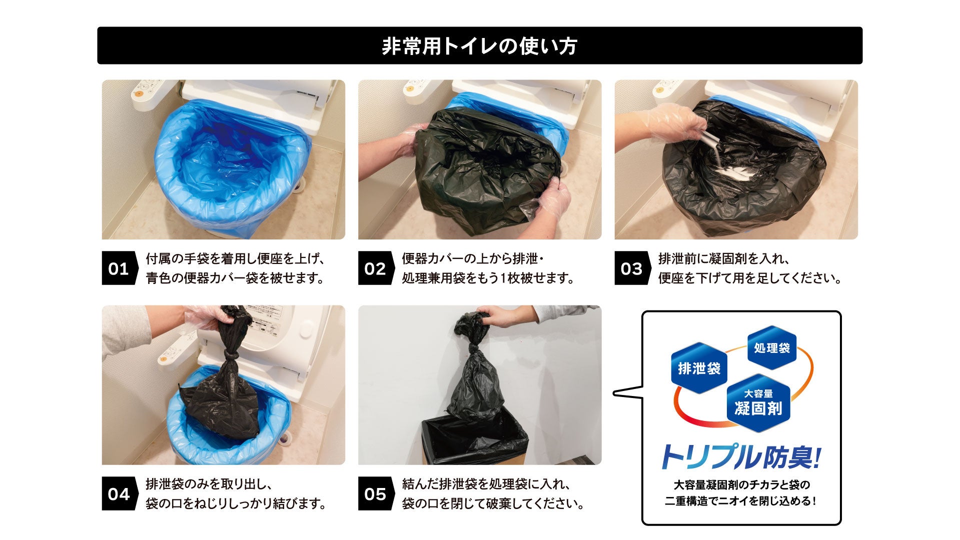 排泄袋と処理袋の二重構造により、ニオイが外に広がりにくく、室内や避難所での使用にも配慮しています。