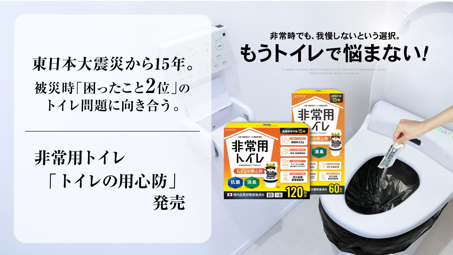 「本当に必要とされる商品を世界に流通させる」という理念のもと、数多くのベストセラー商品を世に送り出してきた株式会社Extage(大阪市中央区、代表取締役社長:野口拳大、以下「Extage」)は、EXCITECH(エキサイテック)ブランドから、非常用トイレ『トイレの用心防』を2026年3月11日より発売いたします。