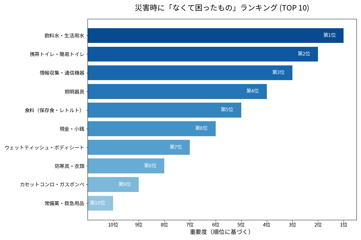 防災システム研究所の「東日本大震災で困ったものランキング」では、災害時に「なくて困ったもの」としてトイレが2位に挙げられています。一方で、複数の調査では簡易トイレを備蓄している家庭は3割弱にとどまっており、必要性が認識されながらも備えが十分に進んでいない現状が浮き彫りになっています。