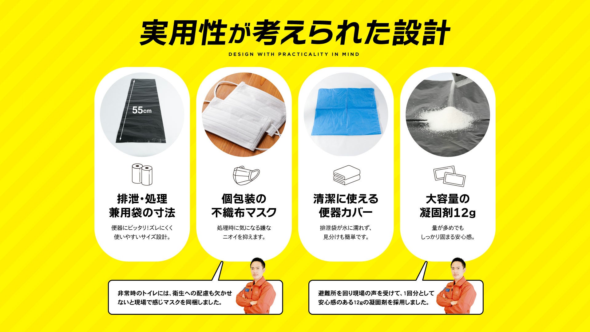 また、排泄処理時の衛生面・心理面の負担を考慮し、使い捨てマスクを同梱。60回セットには2枚、120回セットには4枚を付属し、非常時の備えとしての安心感を高めています。