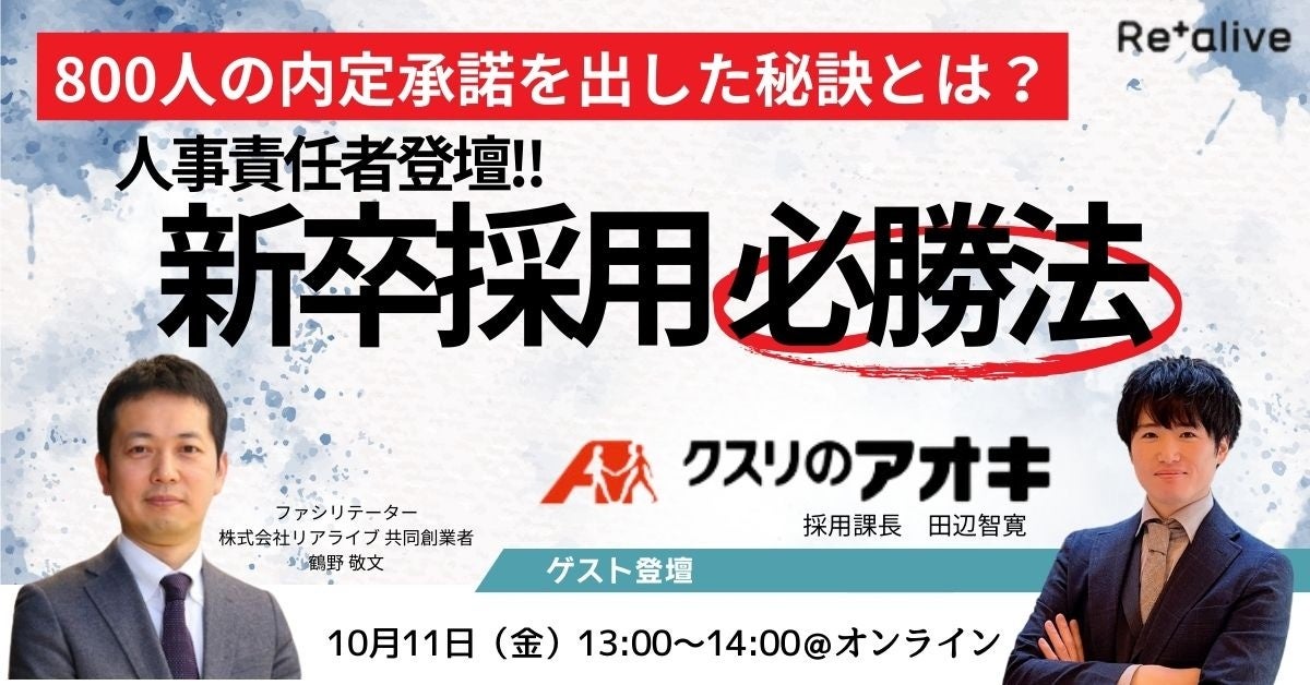 そんな悩みを抱える人事担当者のために、800名もの内定承諾を実現した株式会社クスリのアオキの人事責任者にご登壇いただき成功の秘訣を伝授します!