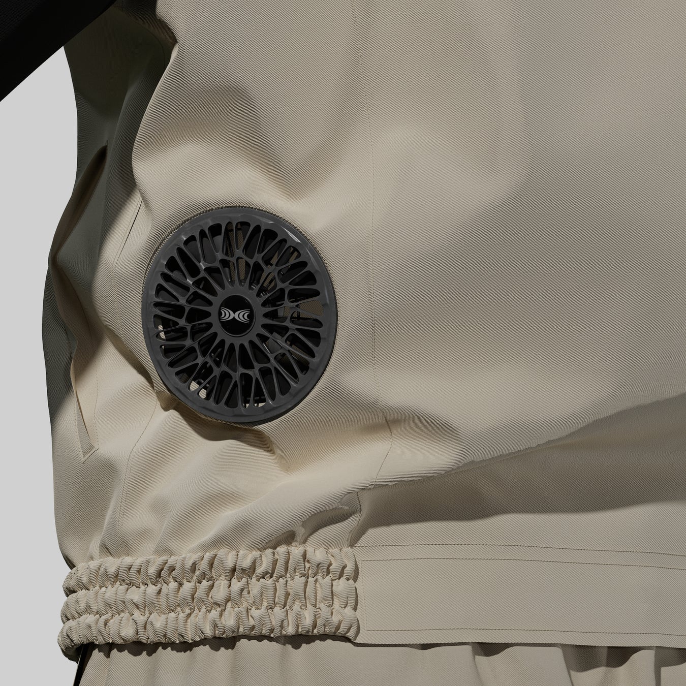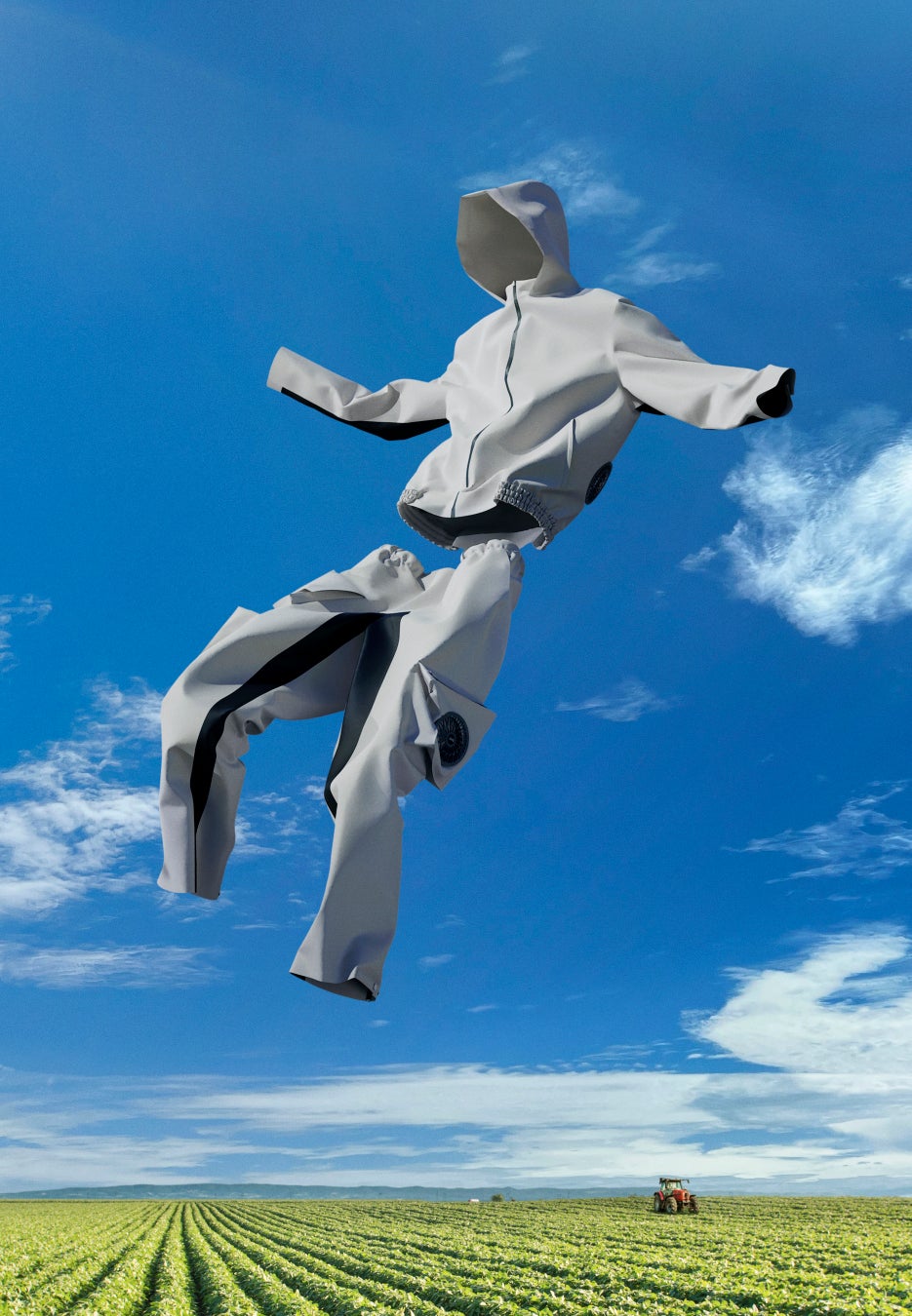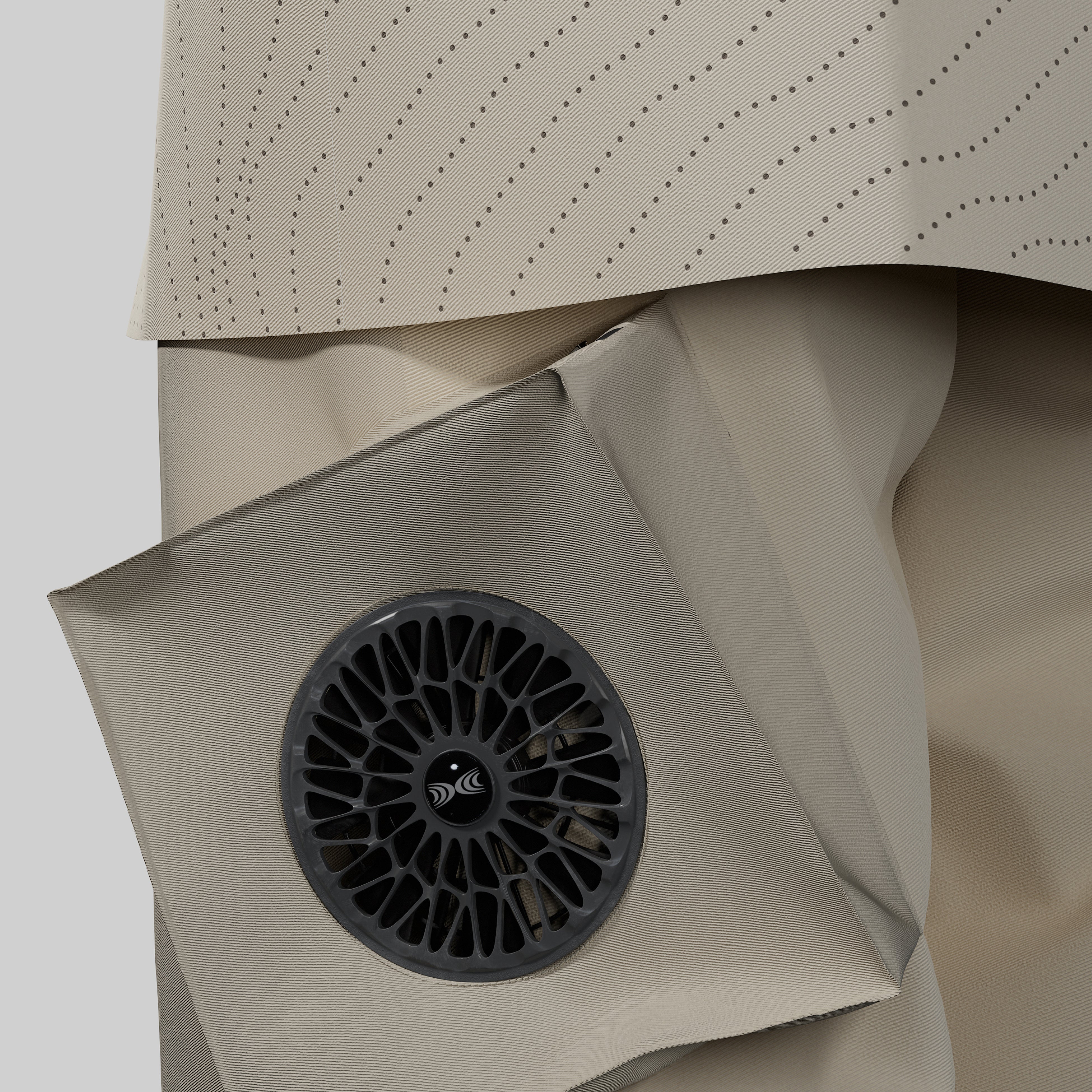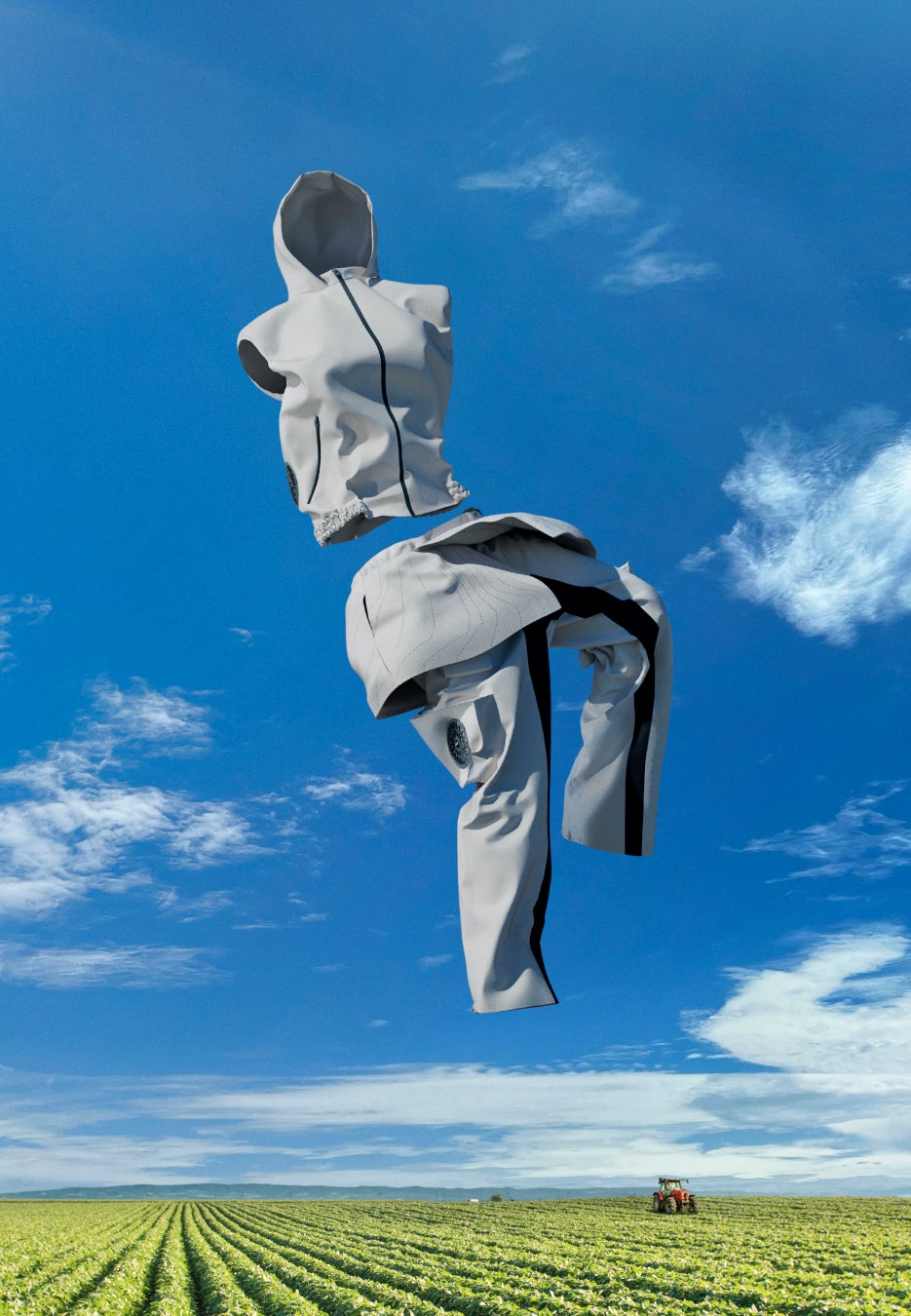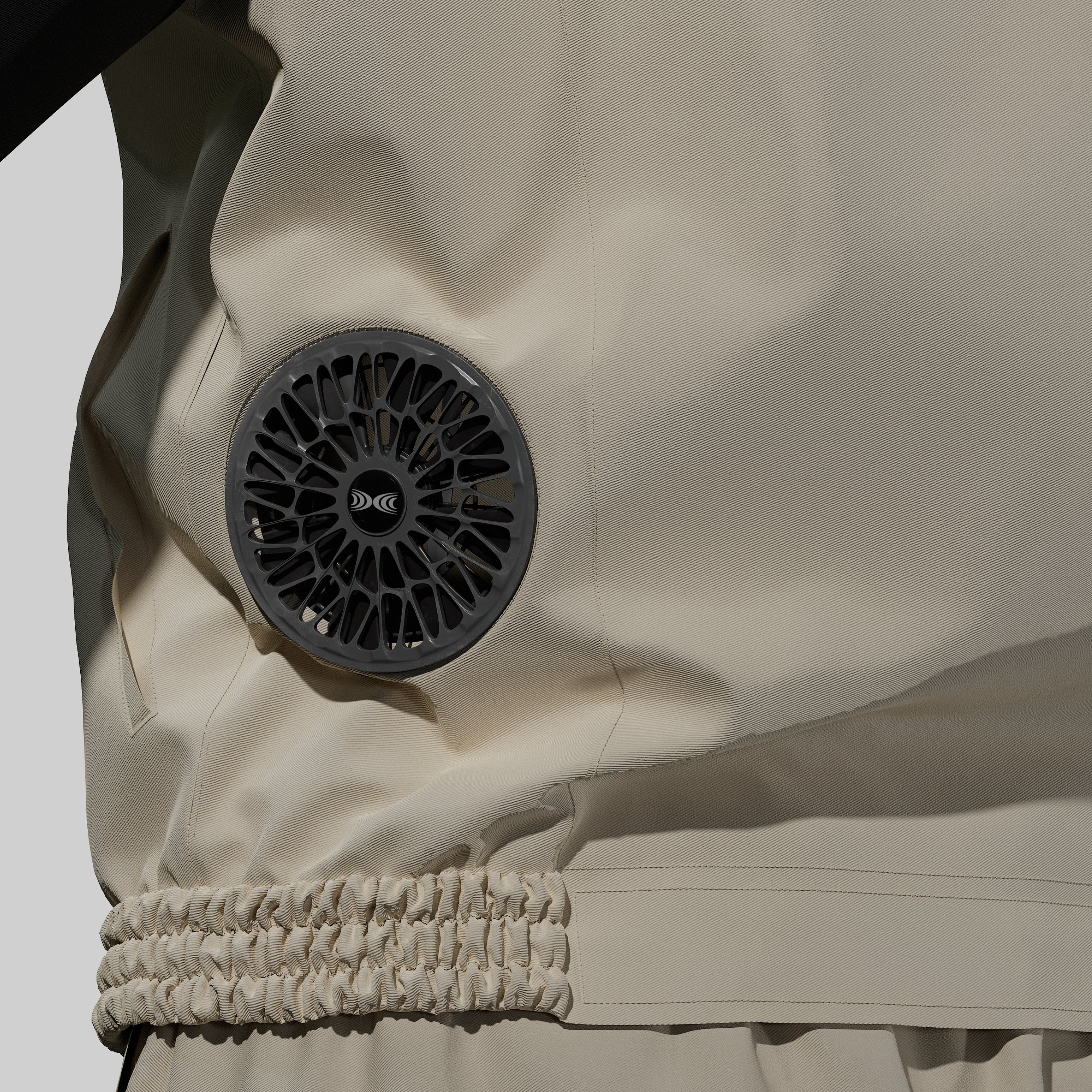 「HOPE WEAR for Farm」は、農業との暮らしを持続可能に、そして地球沸騰化時代に対応することを目指して、新しい農業ユニフォームとして開発されました。空調服®(※1)のファン技術とSOLAMENT®を統合し、ファンが作り出す空気層によって遮熱効果を最大化。一般的な作業服と比較して最大19.3℃の温度低下を実現しました(※2)。Algorithmic Coutureによる、動きやすさと廃棄削減を両立したパターン設計が施されています。