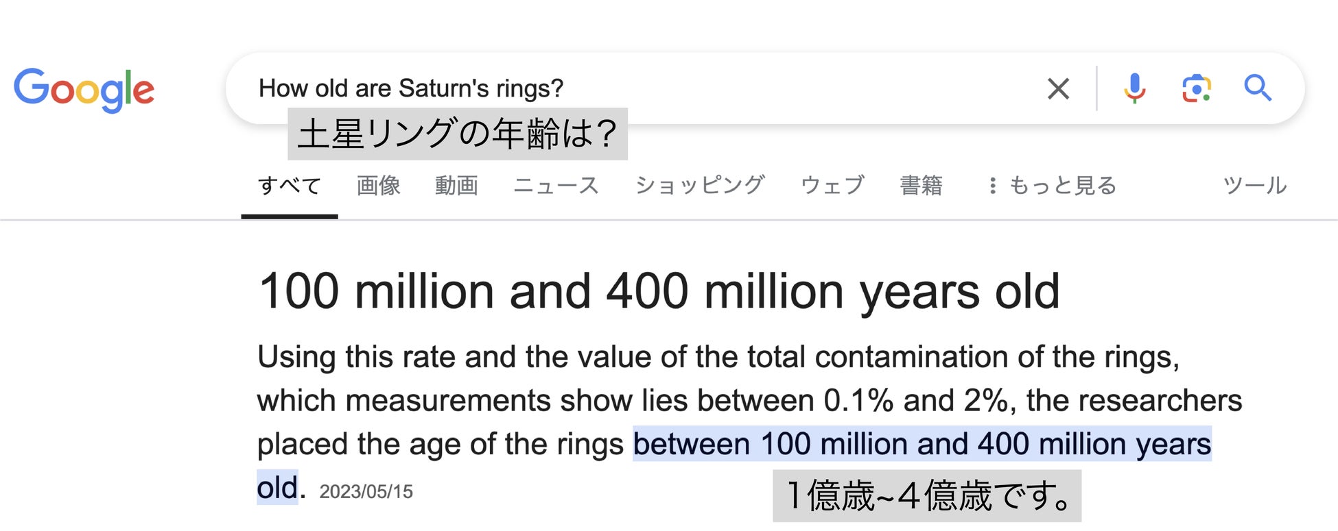 参考情報として、2024年12月現在、Google 検索で土星の環の年齢を調べると「1億〜4億歳」と回答されます。このように、土星の環は比較的若いというのが、これまでの定説として認識されています。