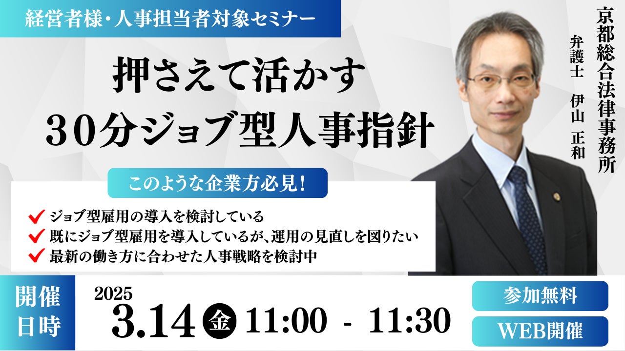 企業法務分野に精通した京都総合法律事務所(所在地:京都府中京区)は、企業の経営者様を対象に、無料セミナー「押さえて活かす30分ジョブ型人事指針」を2025年3月14日(金)に開催いたします。