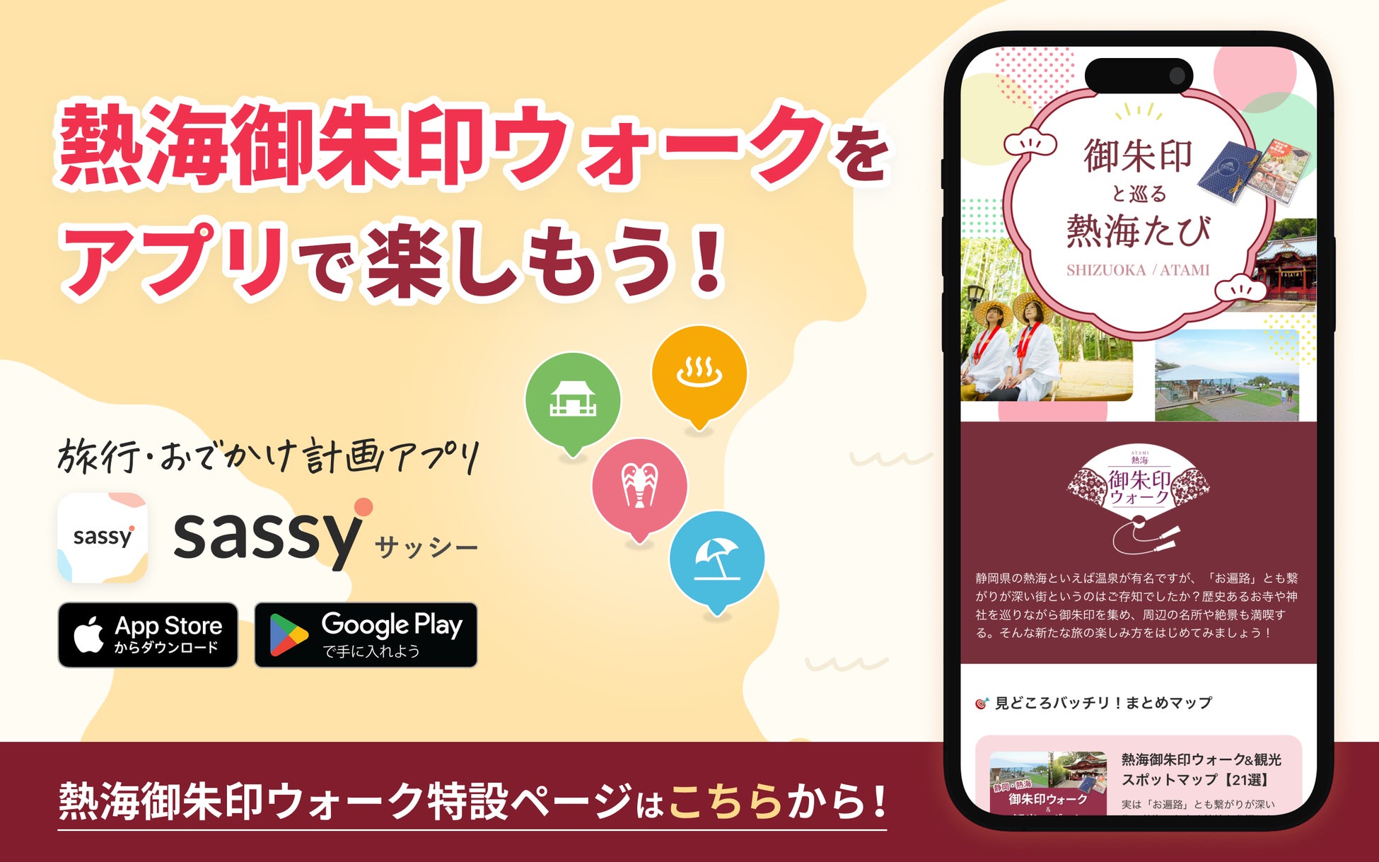 旅行・おでかけ計画アプリ「sassy」で「熱海御朱印ウォーク」をお楽しみいただけます。Webでもご覧いただけますが、アプリをダウンロードすると、熱海御朱印ウォークのしおりを自由にカスタマイズできるなど、さらに便利な機能が使えるようになります。下のリンクから、ぜひお楽しみください!