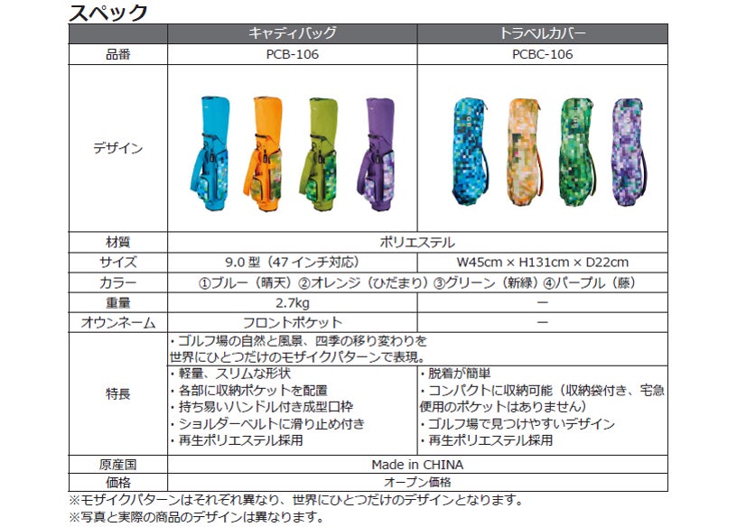 「スタンダードモデル」のカラーはゴルフ場で目にする自然と風景、四季の移り変わりをモザイクパターンで表現したブルー、オレンジ、グリーン、パープルの4色展開。気軽に、身軽に、ゴルフ場に行きたくなるデザインとなっています。