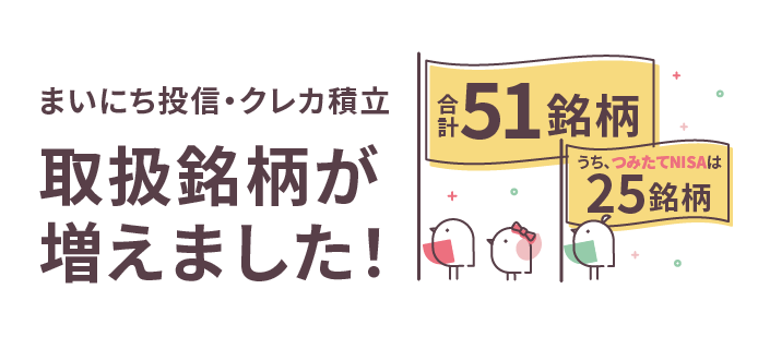 これにより、当社での取扱銘柄数は51銘柄(うち、つみたてNISA対象銘柄は25銘柄)となりました。