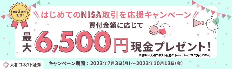 まだ大和コネクト証券で、一般NISAまたはつみたてNISA口座でお取引をしたことがないお客さまが、キャンペーン期間中に、当該口座で対象商品を累計3,000円以上買付すると、現金を最大6,500円プレゼント!!