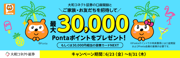 大和コネクト証券にてPonta会員ID連携をしている方が、これから資産運用を検討されるご家族やご友人の方をご招待いただくと、1人目の招待で5,000Pontaポイントをプレゼント、最大25,000Pontaポイント(5人招待)をプレゼント!!さらに、これまでに一度もご家族・お友だちを招待されていない方に限り、1人目招待時にプラス5,000Pontaポイントをプレゼント!最大30,000Pontaポイントをプレゼントいたします!!
