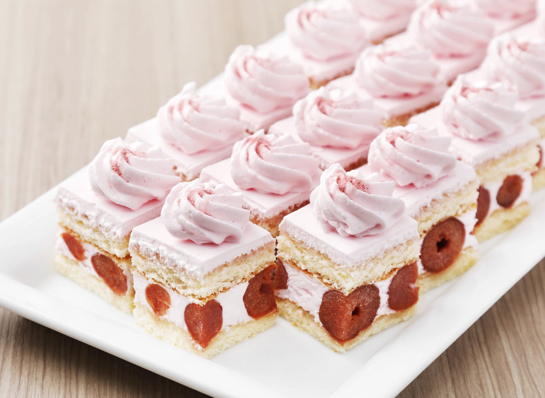 サクラ香るシャンティでチェリーをサンドしました。口に入れた瞬間に広がる華やかなサクラの香りと、ジューシーなチェリーの甘味が際立つショートケーキ。