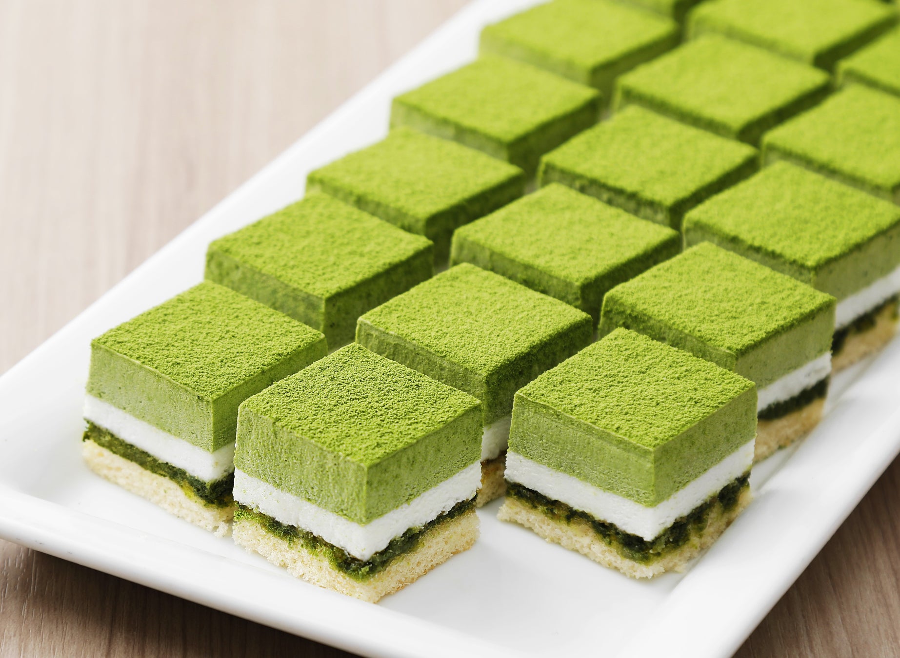ミルキーな練乳のムースにほろ苦い抹茶のムースを合わせました。みずみずしい緑が目を引く、春の訪れを感じさせる一品。