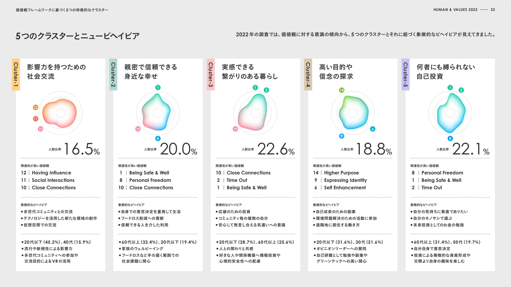 本レポートは、ビジネスに影響を与える蓋然性が高い価値観を5つのクラスターに分類し、紹介しています。また、価値観に対する意識の傾向から、5つのクラスターに紐づくビヘイビア(行動)を分析し、それぞれのクラスターが組織・サービスに求めることを考察しています。