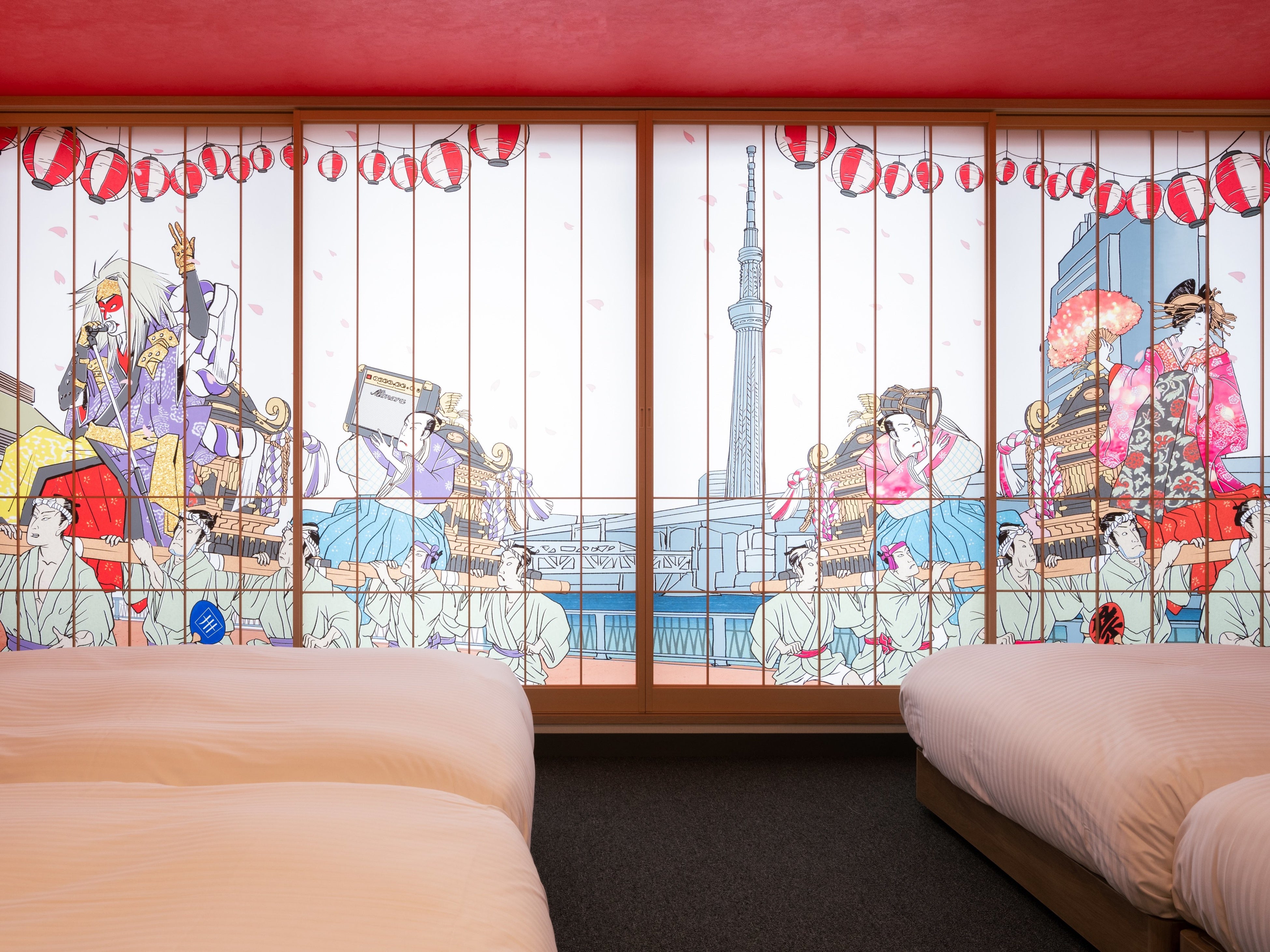 江戸時代に浮世絵を販売した「絵草子屋(えぞうしや)」に見立てた「浮世絵ルーム」は、部屋中に浮世絵を散りばめた空間。透過性のある障子に東京の街並みを描き、障子を開けると都心方向の空が広がる特別なお部屋となっています。