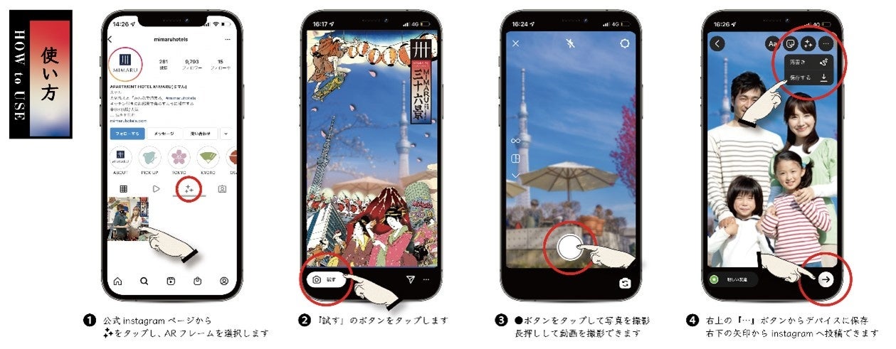 お手持ちのスマートフォン上に、目の前の風景と浮世絵が重なり、オリジナリティあふれる動画や写真を撮影できます。