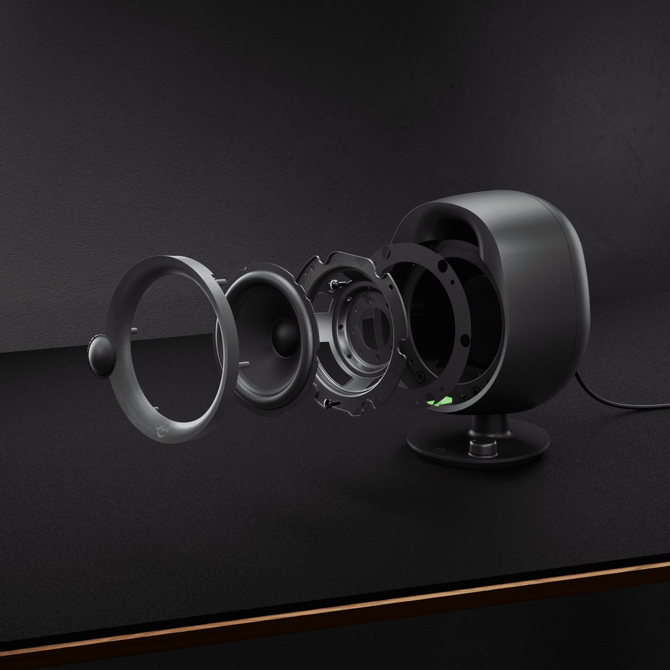 一般的なPC用スピーカーと比べ圧倒的に大きな4 inchドライバーを採用し、ゲームサウンドの澄み切った高音、生き生きとした中音、パワフルな低音を忠実に再現しています。