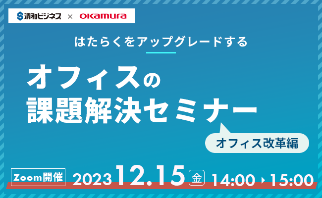 昨年11月に開催した〈オフィス家具編〉に続き株式会社オカムラ様をゲストにお招きし、オフィスづくりのポイントをご説明いただきます。清和ビジネスからは、オフィス課題の解決に向けて行った3社のオフィス改革事例をご案内させていただきます。