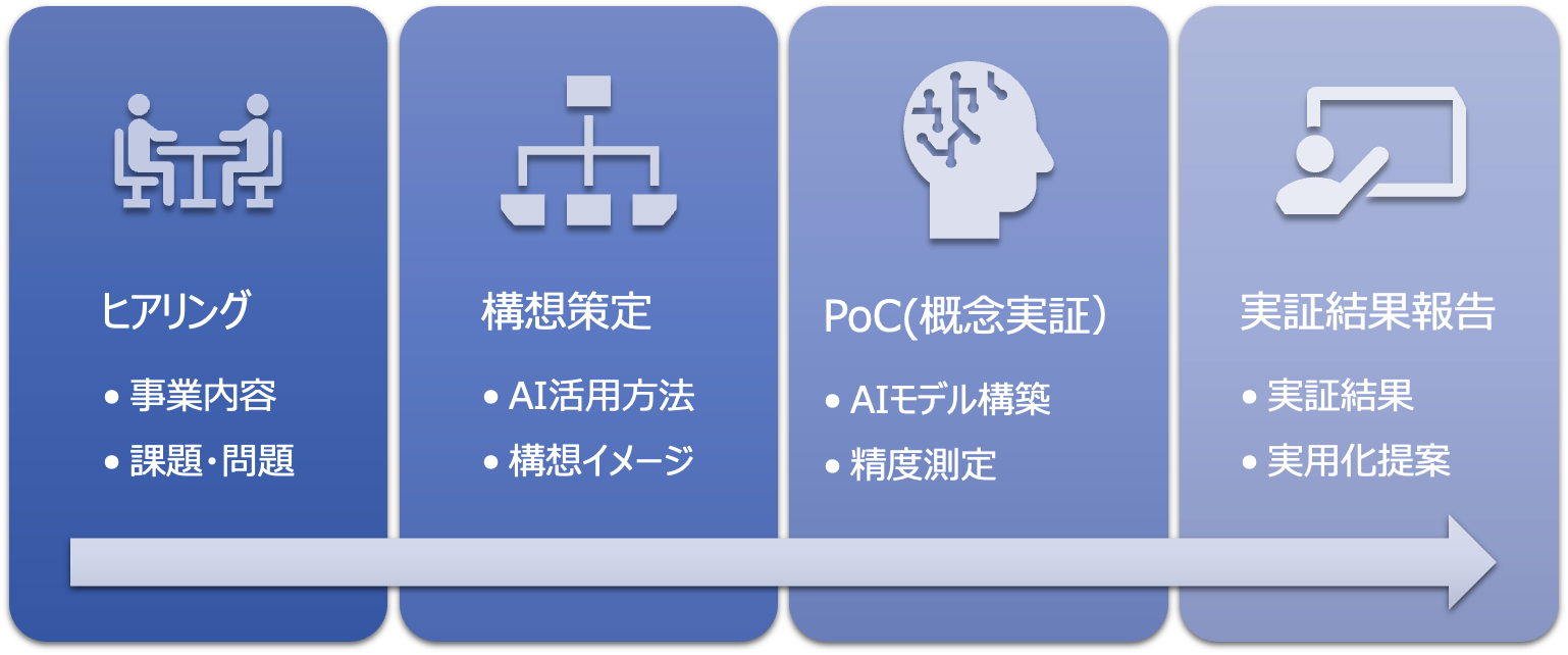 Vertex AIコンサルティングサービスはGoogle社のAIサービス(Vertex AI)を利用したAI活用を支援するサービスです。お客様の事業や課題のヒアリングより、AIサービス選定や活用方法を企画いたします。データを受領した後、企画のPoCをクイックに実施。結果に基づき活用に向けた具体的なご提案までいたします。