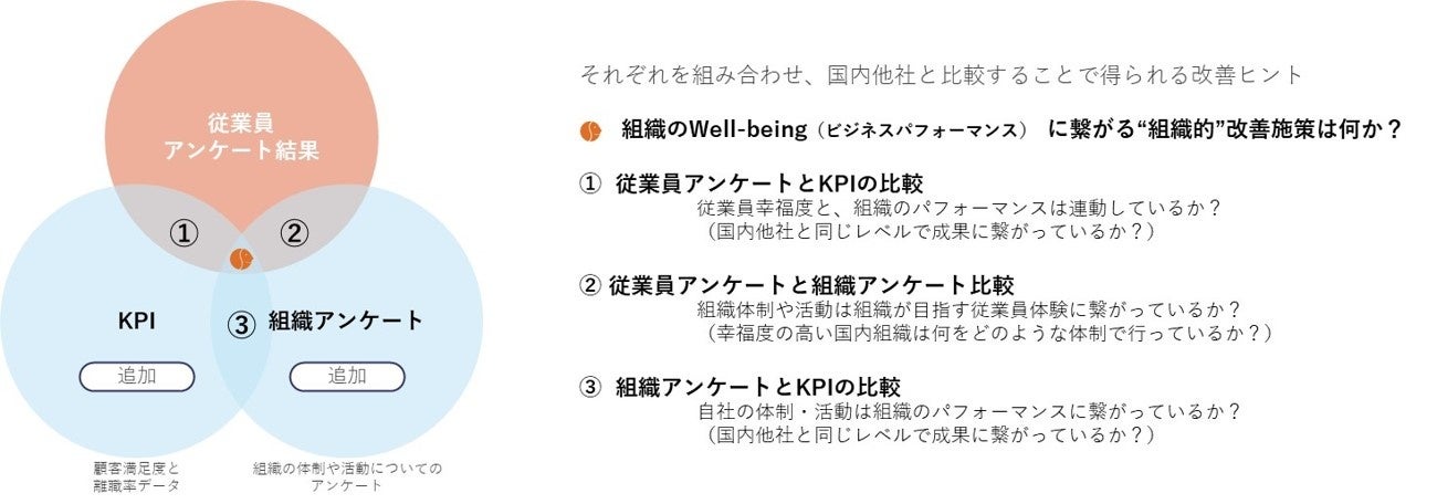従来の従業員アンケートに加え、新たにこれらの診断を実施し、自社内だけでなく国内他社との比較することで、今まで以上に明確に「改善のために組織として何をすべきか」特定しやすくなります。