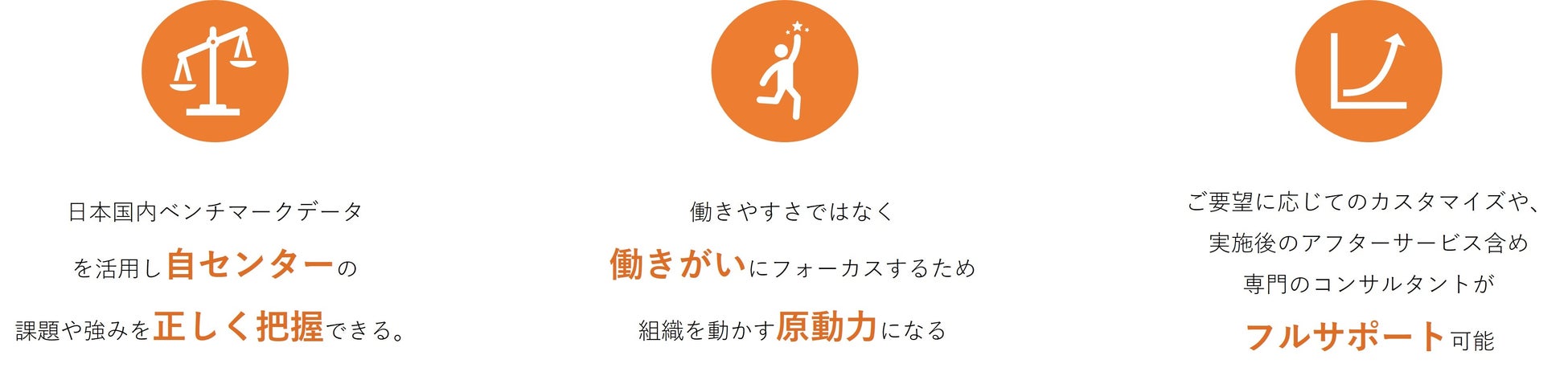 2024年度より診断体系をアップグレードいたしました。診断を実施することでセンターの従業員1人ひとりの職場での体験を鮮明化させることはもちろん、それら個々の体験を組織のマネジメントの実態に紐づけて分析できるようになります。ここで得た示唆をもとにマネジメントに関わる皆さまは、具体的な方針をもって現状のセンターをさらに良い状態へ導くことができます。