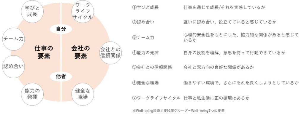 エントリー組織に実施頂くのは弊社が開発したオリジナルアンケート「Well-being診断」です。センターで働く従業員の幸福度と相関する7つの要素を中心に「従業員幸福度・Well-being」にフォーカスした設問で構成されています。